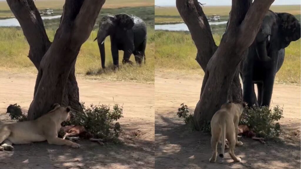 वीडियो में आप देख सकते हैं कि पेड़ के नीचे एक शेरनी आराम फरमा रही थी, तभी वहां एक हाथी पहुंच जाता है. ऐसे में शेरनी डर के मारे उठ जाती है और इसी सोच में रहती है कि कहीं हाथी उसपर अटैक ना कर दे. वहीं, हाथी भी डर रहा होता है कि कहीं शेरनी ना उसपर अटैक कर दे, इसीलिए वो पेड़ से थोड़ा दूर हट जाता है और शेरनी को डराने की कोशिश करता है. अब जाहिर है कि हाथी आकार में बड़ा होता है, इसलिए शेरनी का डरना का लाजिमी था, क्योंकि अगर दोनों की भिड़ंत होती तो शेरनी के ही हारने के ज्यादा चांसेज थे. इसीलिए शेरनी ने वहां से भाग जाना ही उचित समझा और अपनी जान बचा ली.