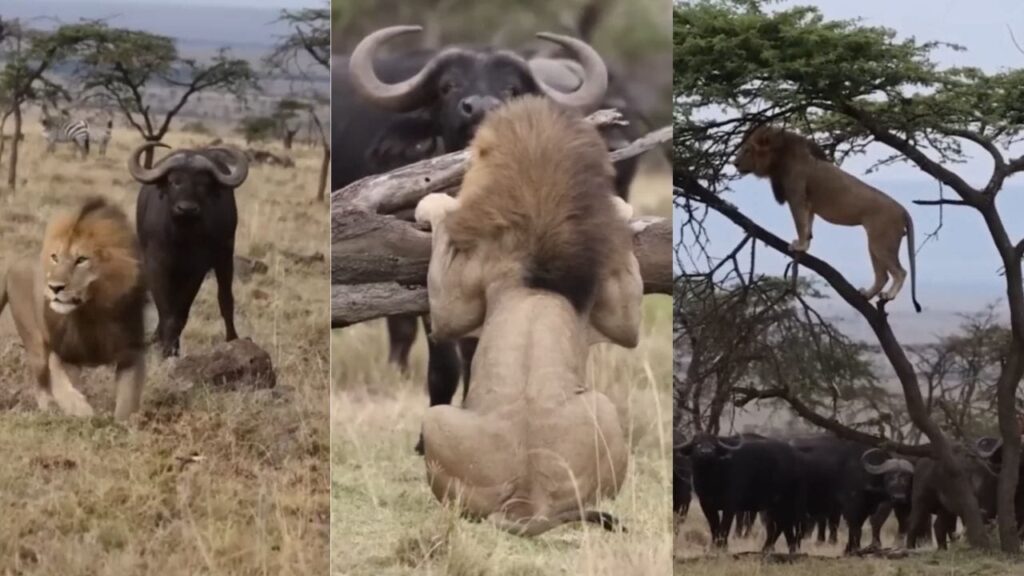 वीडियो की शुरुआत एक जंगल से होती है, जहां शेर के अलावा भैंस और जेब्रा जैसे जानवर भी मौजूद थे. वीडियो में आप देख सकते हैं कि शेर एक भैंस का शिकार करने की फिराक में था. वो बार-बार उसके पास जाने की कोशिश करता है, लेकिन फिर लौट आता है. पहले तो समझ नहीं आता कि आखिर माजरा क्या है, लेकिन जैसे-जैसे वीडियो आगे बढ़ता है, मामला क्लियर हो जाता है. वहां भैंसों का एक पूरा झुंड मौजूद होता है, जिनके डर से वो शिकार नहीं कर पाता. भैंसों के झुंड ने तो उसे ऐसा डराया कि सबसे पहले वो एक पेड़ के पीछे छिपा और फिर बाद में पेड़ के ऊपर ही चढ़ गया, ताकि जान बच सके, क्योंकि भैंसें आक्रामक हो गई थीं.